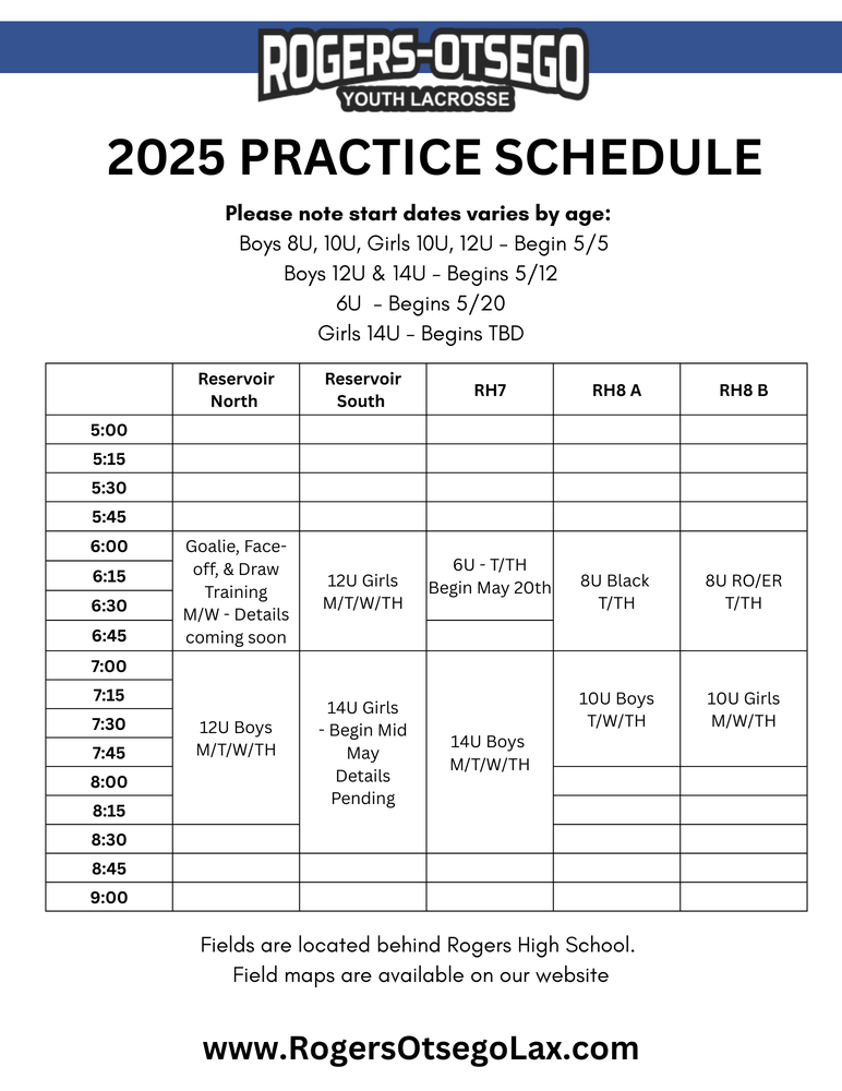 The evaluation week schedule for 12U and 14U Boys is set!We will be OUTSIDE beginning May 5th. Please refer to the photo for your schedule the week of 5/5-8.