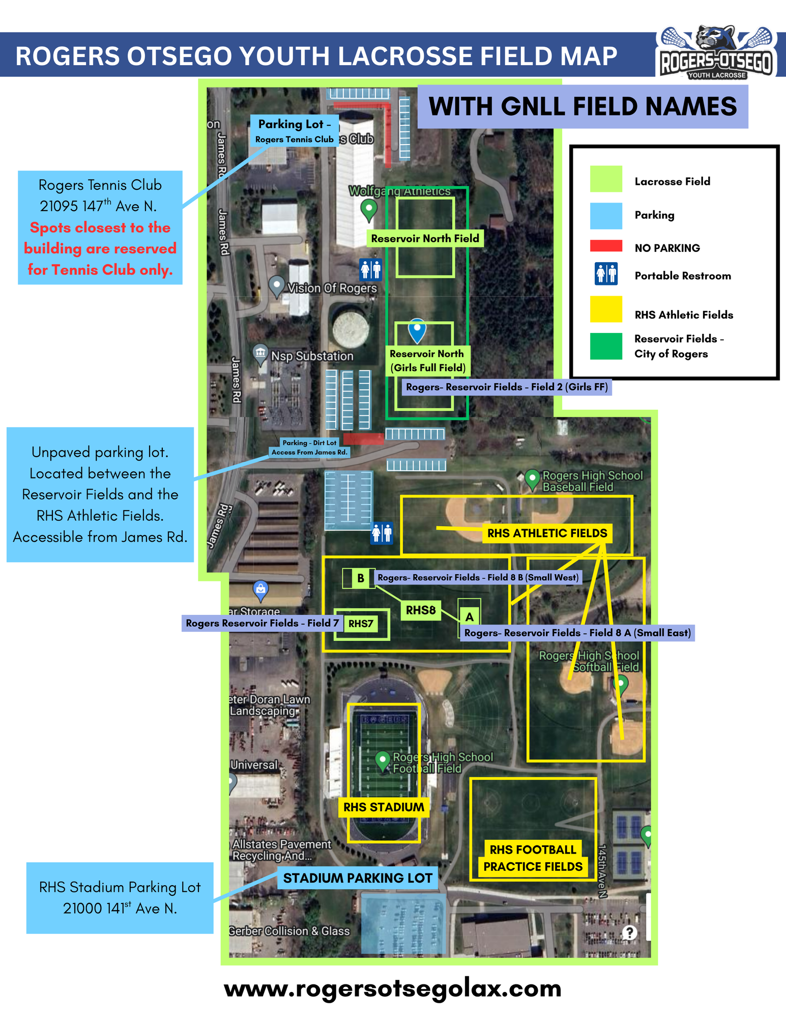 - The unpaved lot between the Reservoir Fields and the Rogers High School Fields Accessible from James Rd - Recommended for Reservoir South and RHS 7 and RHS 8A & 8B