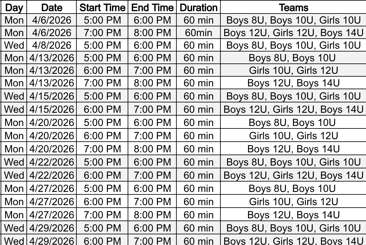 April Practices will be 60 Minutes - 2 times per week.