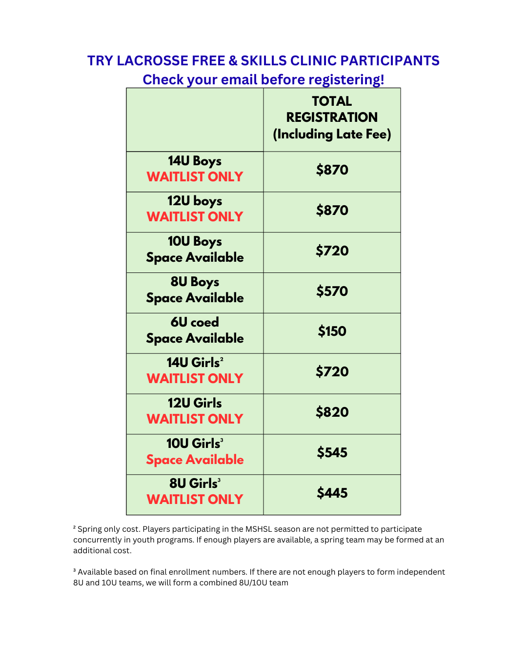 Note: if your players grade based move may result in a LOWER price, please utilize the payment plan and the price will be adjusted on your 2nd payment.