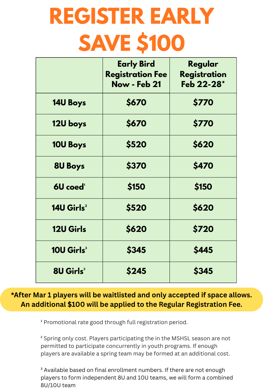 Late Registration: Mar 1 & later, will be accepted as WAIT LIST ONLY and be charged the Regular Registration fee PLUS $100. Players will be placed on a first-come, first-served basis only IF space allows.
